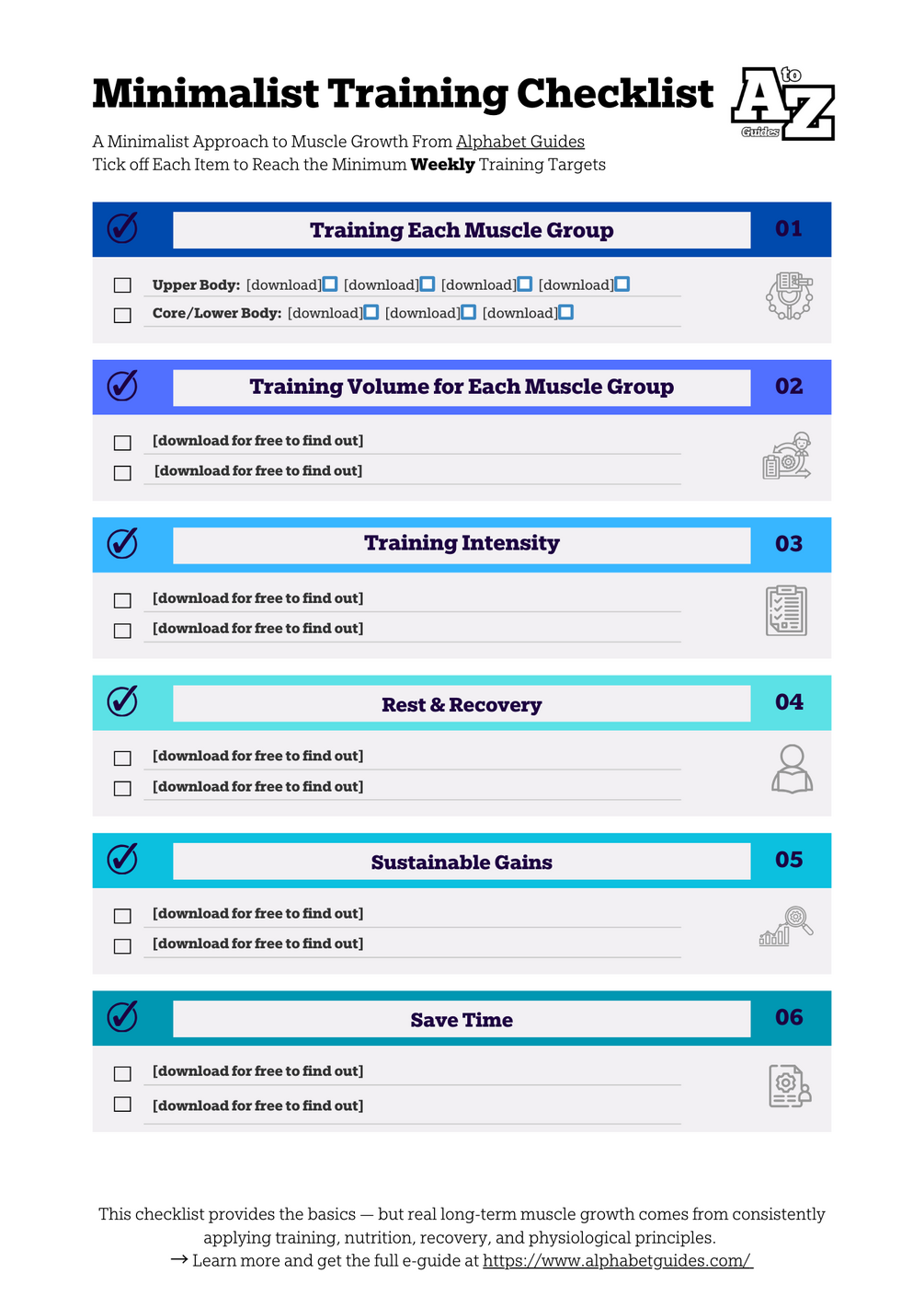 The checklist consolidates some fundamental principles of muscle growth into a 1-page checklist. Based on research and practical applications outlined in full in our Minimalist Muscle Growth Resource and A to Z Guide to Muscle Growth.